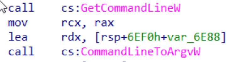 The malware retrieves the command-line string for the process using the GetCommandLineW API and CommandLineToArgvW is used to obtain an array of pointers to the command-line arguments.