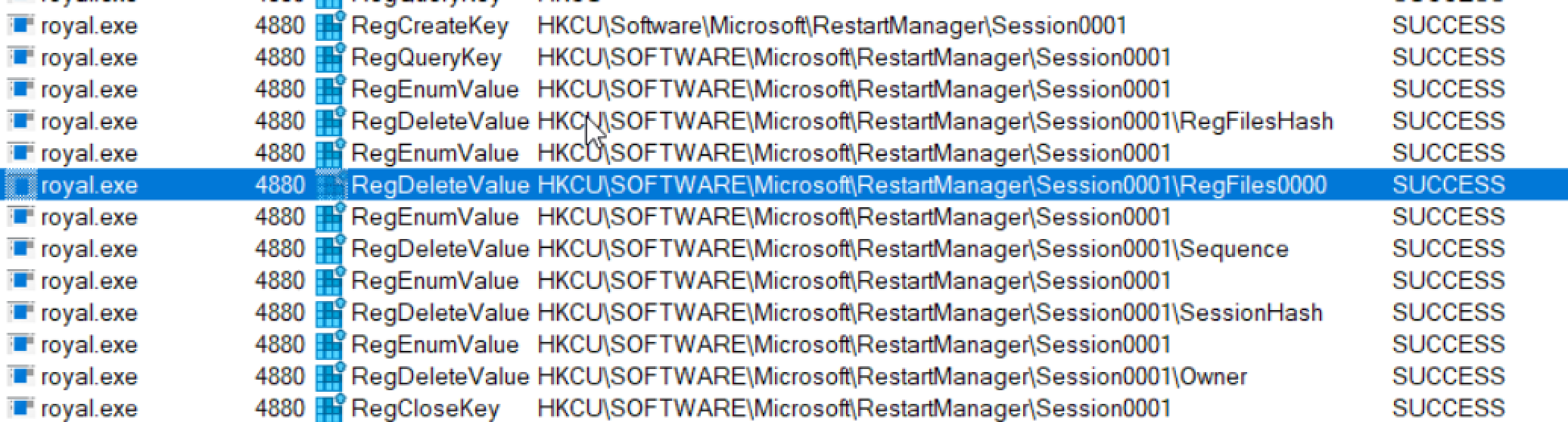 If files to be encrypted are being used by other applications, Royal uses RestartManager to kill the various processes that are using the files to be encrypted. The below query detects five such events that occurred within a minute.