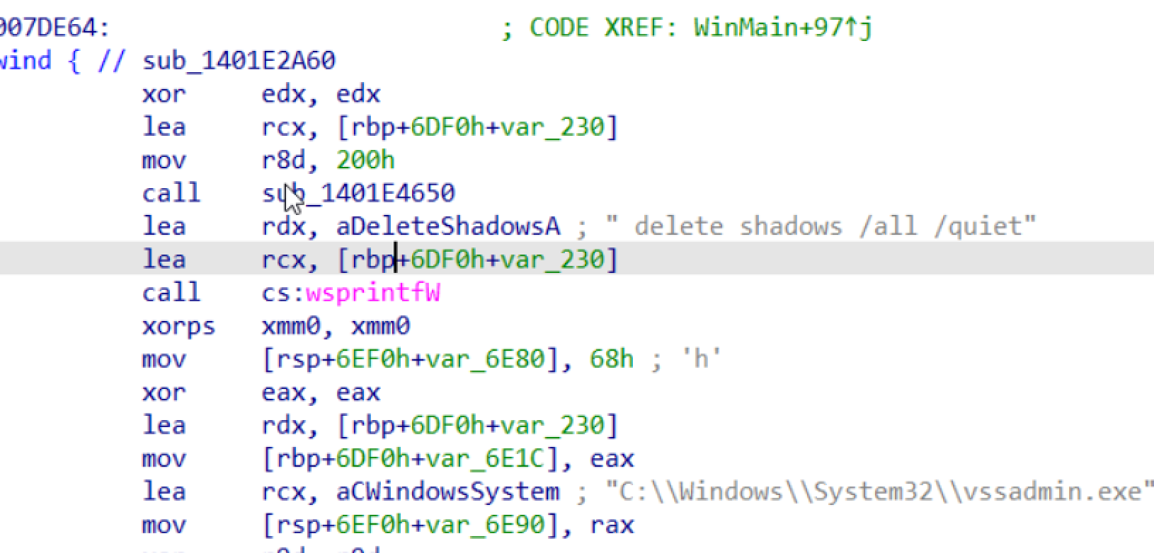 While executing the malware we observed the malware spawning child process for running vssadmin to delete all shadow copies.
