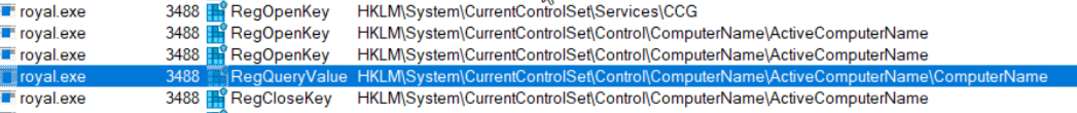 We have also found the instance where Royal was querying the registry key “HKEY_LOCAL_MACHINESYSTEMCurrentControlSetControlComputerNameActiveComputerName” to retrieve the system name.