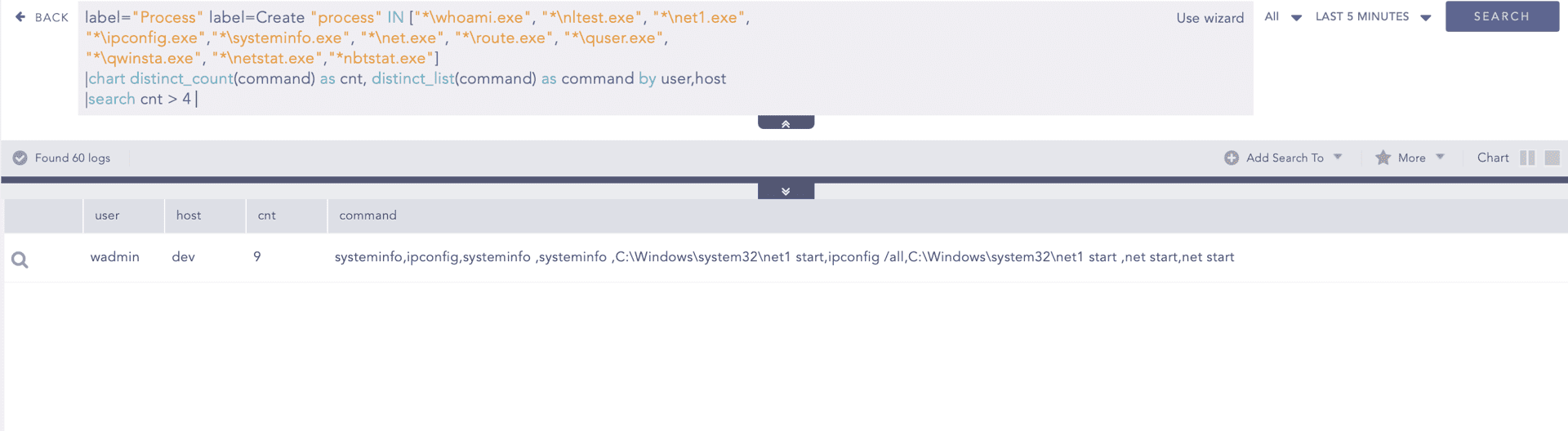 As observed in this campaign, LameHug leveraged native Windows utilities to perform reconnaissance. We can use this alert rule to hunt for reconnaissance activities.