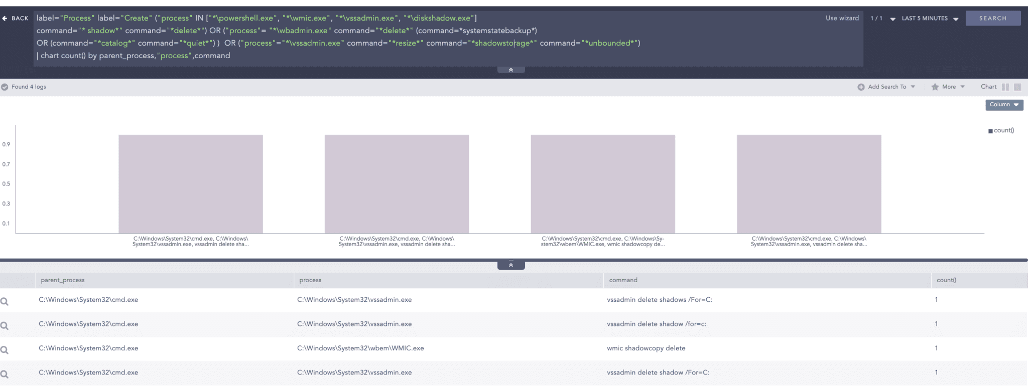 label="Process" label="Create" ("process" IN ["*\powershell.exe", "*\wmic.exe", "*\vssadmin.exe", "*\diskshadow.exe"]
