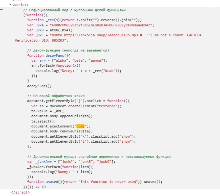 Now, let’s take a step back to understand how this all comes together. When we inspected the ClickFix page, we came across the script shown in the screenshot below. We can observe that the parts of the code are written in Russian. This may suggest that the script may have been written by adversaries from Russia.