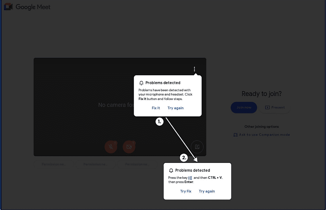 ClickFix Page masquerading as the homepage of a Google Meet (source:ClickFix tactic: The Phantom Meet