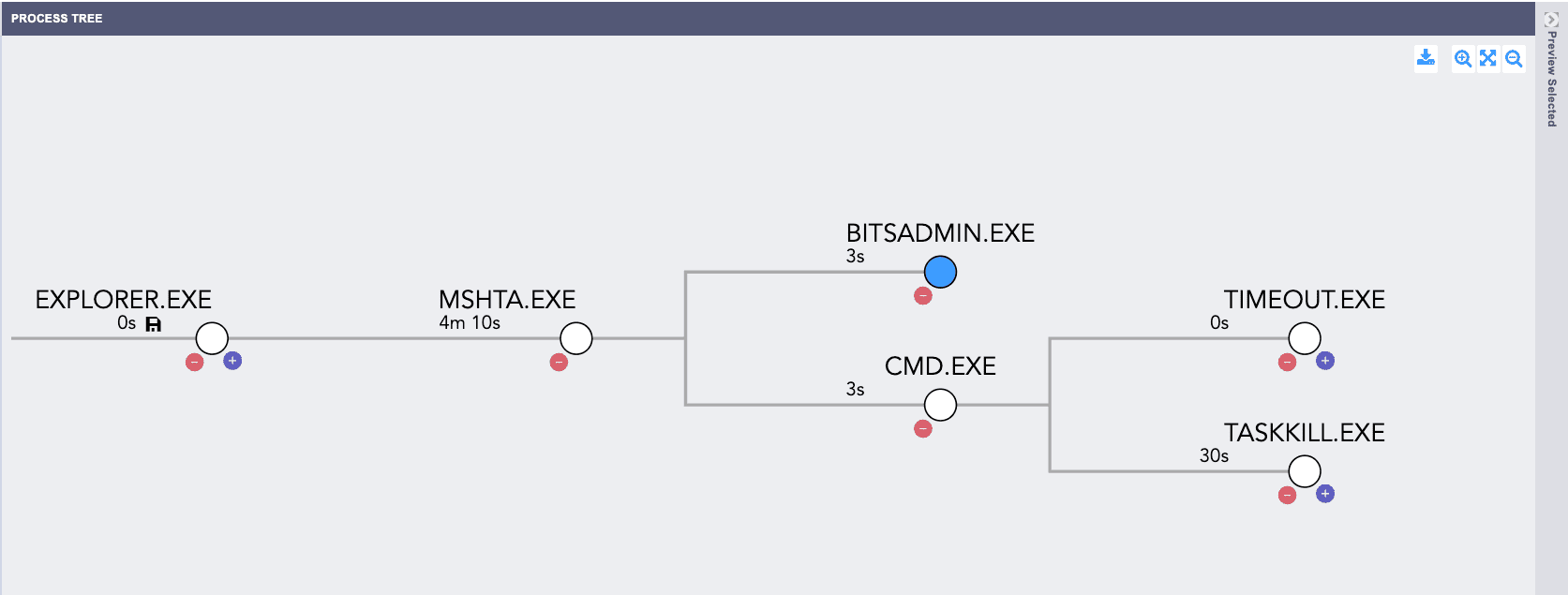 In addition, we can use the query below to hunt for unusual parent-child process relationships of mshta.exe. The following query looks for instances where mshta.exe is either spawned by non-standard parent processes (e.g., powershell.exe, cmd.exe, or explorer.exe) or spawns child processes like cmd.exe or bitsadmin.exe