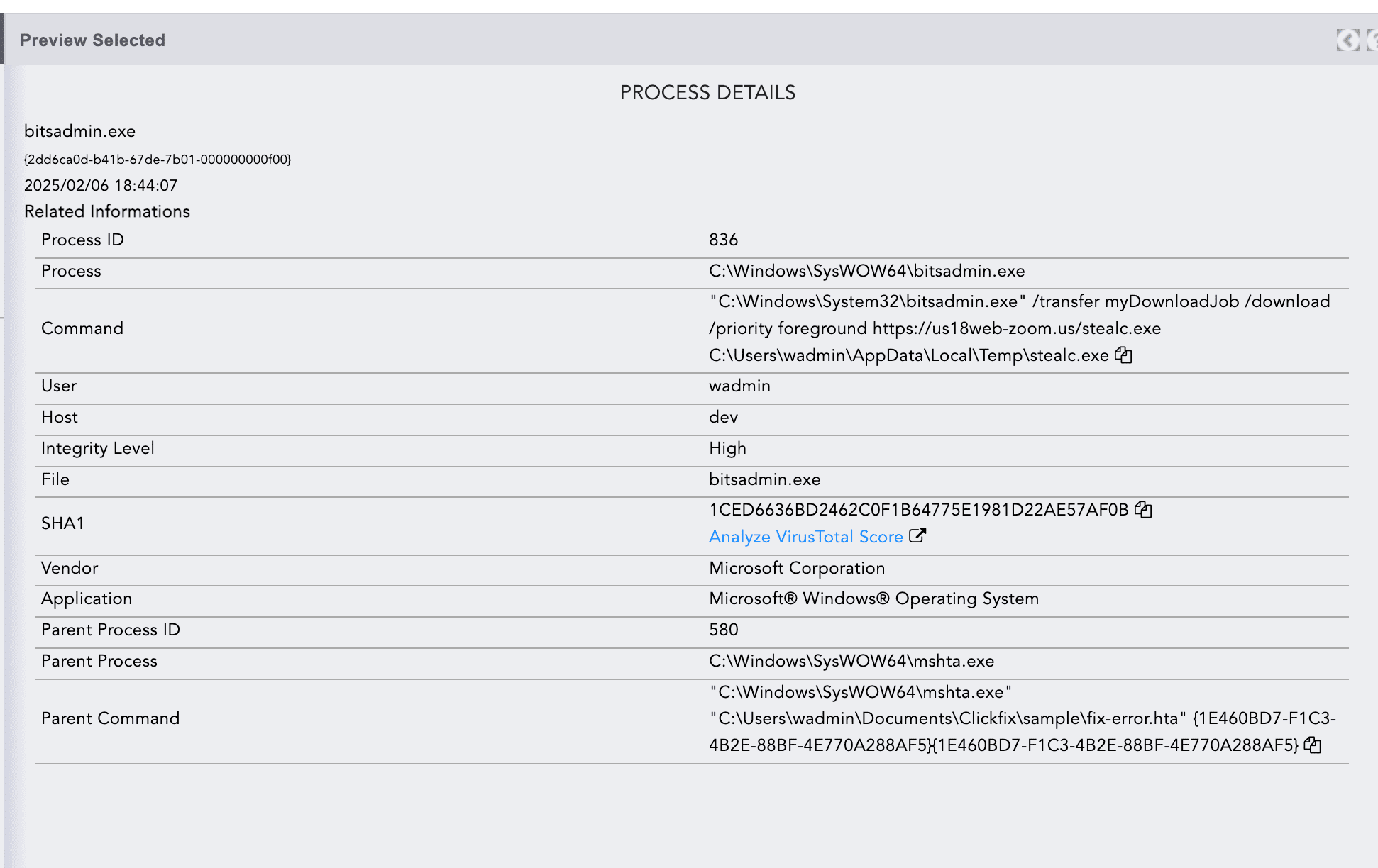 Additionally, ClickFix discreetly leverages the legitimate LOLBAS tool BITSAdmin to download payloads. Detecting this behavior involves observing command-line parameters typically associated with payload retrieval or file transfers.