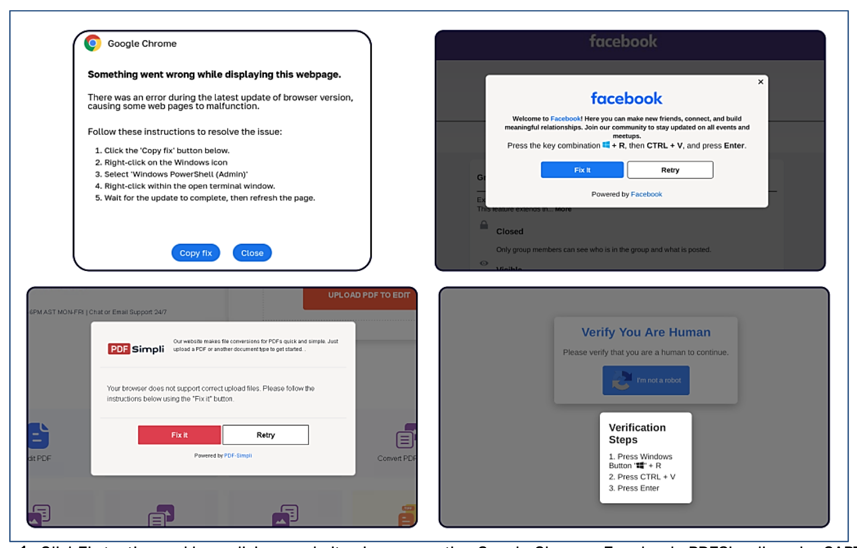 ClickFix tactic used by malicious websites impersonating Google Chrome, Facebook, PDFSimpli, and reCAPTCHA. (Source: Sekoia)