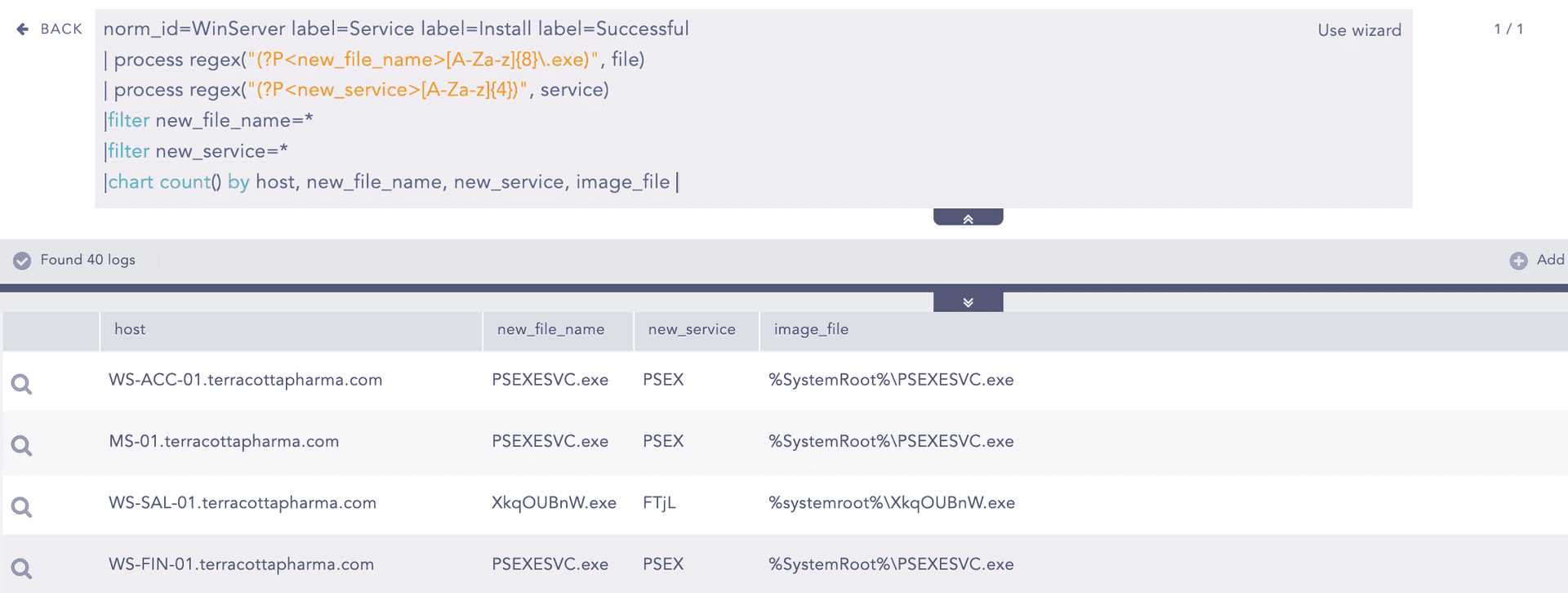 Adversaries frequently lean on built-in Windows tools and popular open-source frameworks, like Impacket and PsExec, to hop laterally through a network. PsExec’s default behavior is to drop an 8-character executable and spin it up as a service with a 4-character name. You can spot this activity with below rule