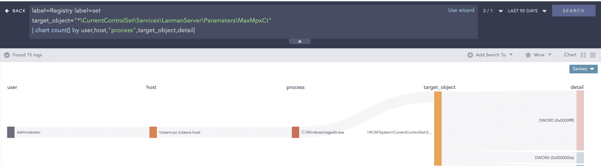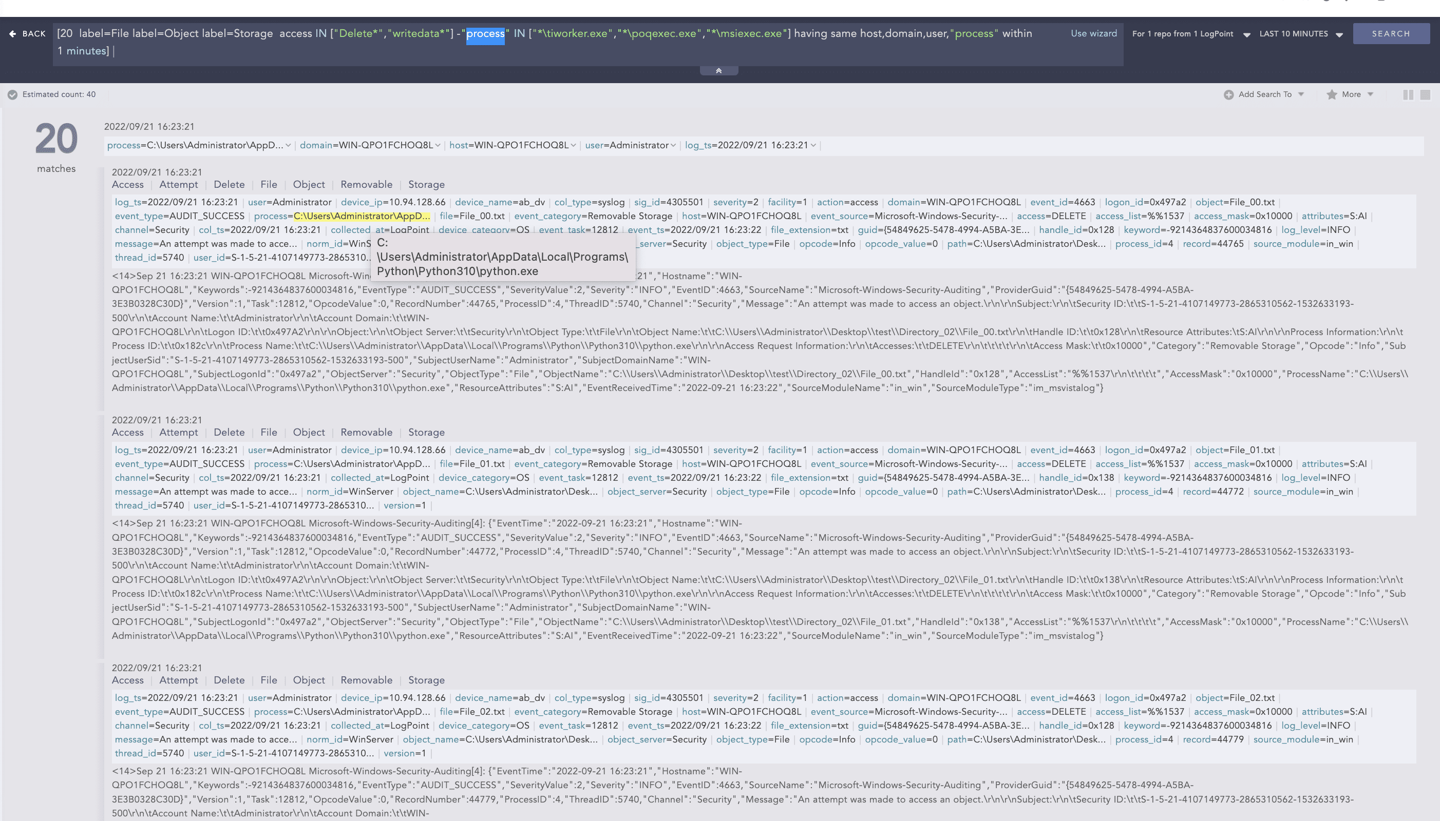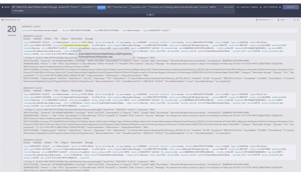 In the above query, the integer value “20” needs to be modified according to the use case. In our case, we have defined 20 file modifications in a minute to indicate suspicious activity.