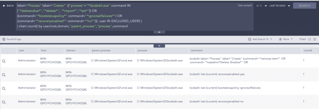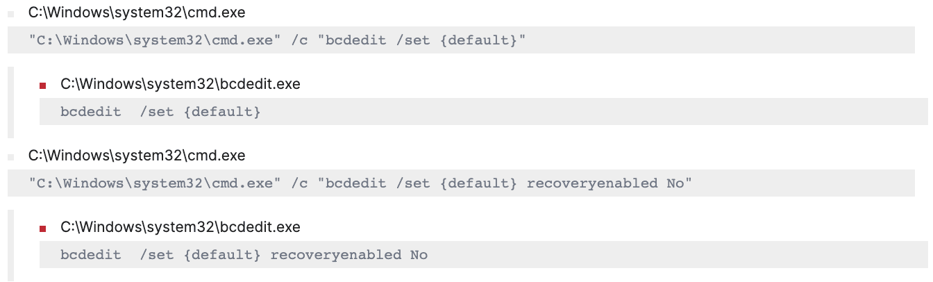 BlackCat also disables recovery in the Windows boot menu using “bcdedit.exe” to inhibit system recovery. We can observe logs for possible modification of boot configuration.