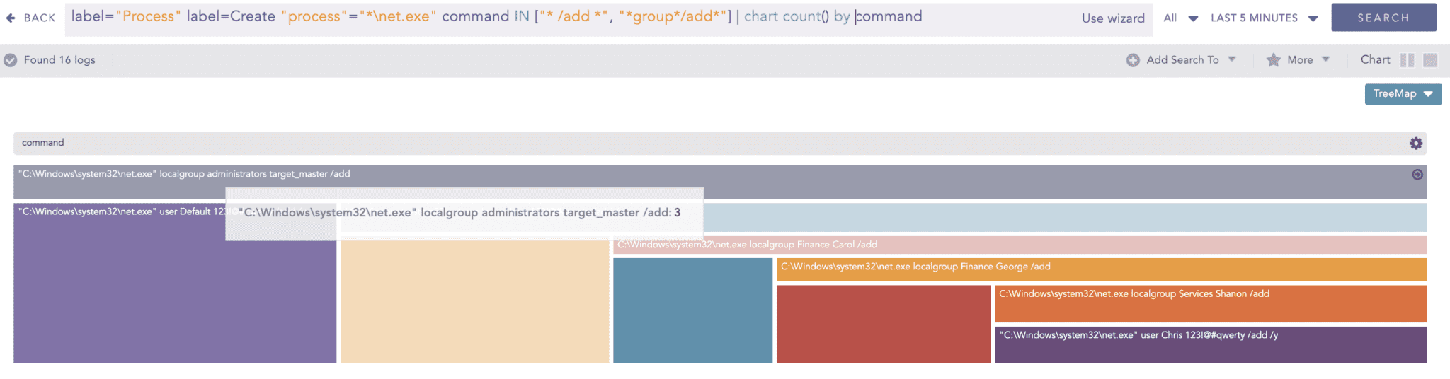 The use of net.exe for the creation of new users and their addition to the administrator group can also be monitored with the following query.