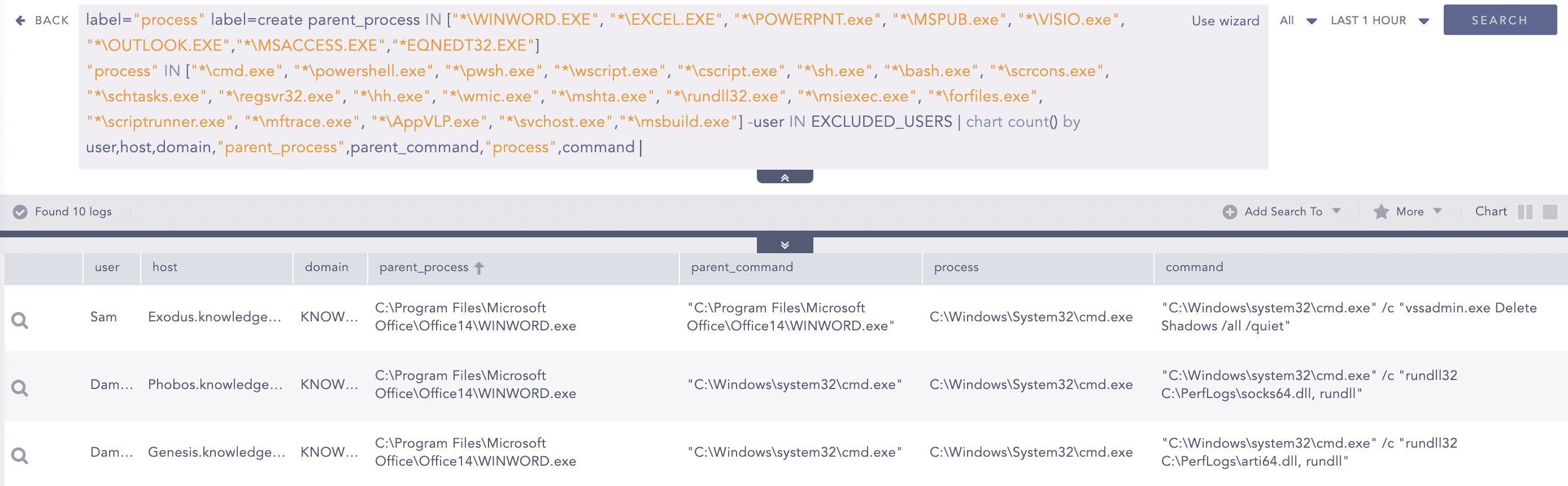 Analysts need to carefully monitor their systems for suspicious activities that can show the possibility of infection. In most cases, BlackCat achieved initial access via spearphishing. Victims were tricked into downloading macro-enabled documents. We can look for suspicious processes spawned by various Microsoft Office utilities.