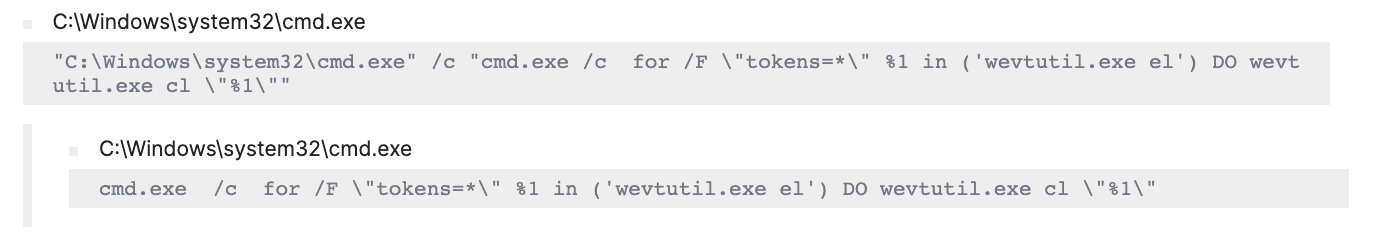 OR ("process"="*\wmic.exe" command="* ClearEventLog *")) OR
