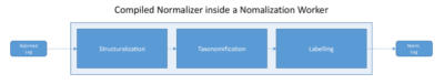 Let’s take a closer look at the inner workings of a compiled normalizer. A compiled normalizer contains a pipeline through which the adorned logs travels and is transformed into a normalized log (the collection mentioned above).