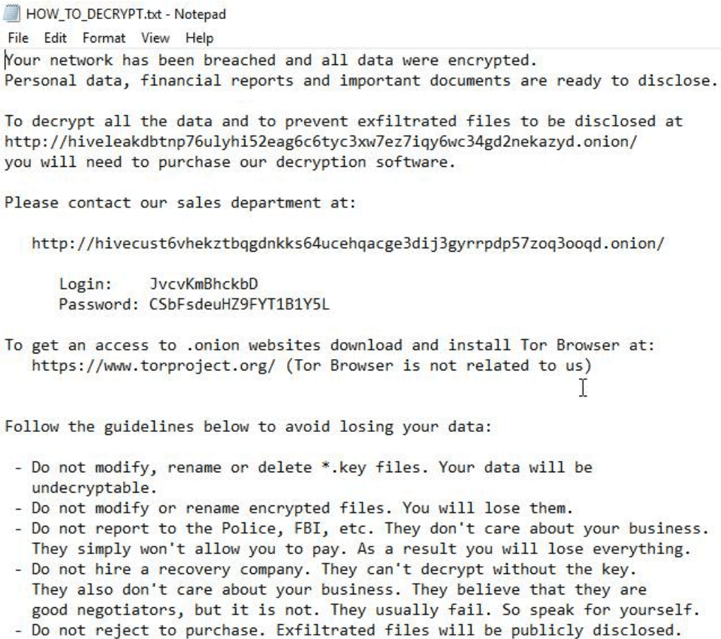 Once the entire disk files have been encrypted, a message pops up in a “HOW_TO_DECRYPT.txt” notepad file, notifying the users about the incident that happened in their system, URL link, and credentials to log in to the hive’s .onion/ portal for negotiations with the “Sales Department”, and guidelines as a warning.