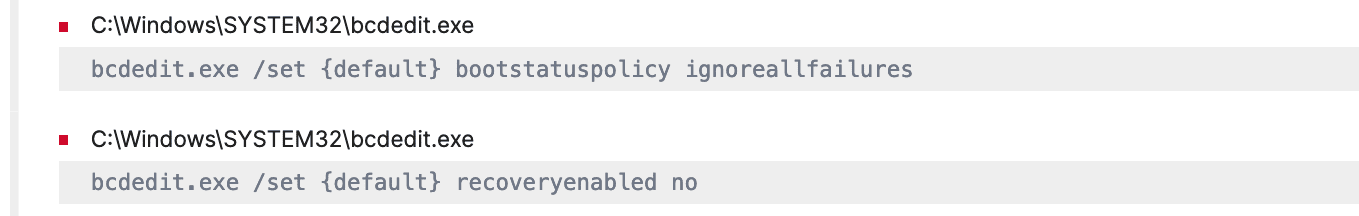 Further, threat actors make sure to deactivate and completely turn off the system administrators’ access to Windows Recovery Environment abusing “bcdedit.exe“ to modify the boot policy, which can be detected as, “Possible Modification of Boot Configuration“
