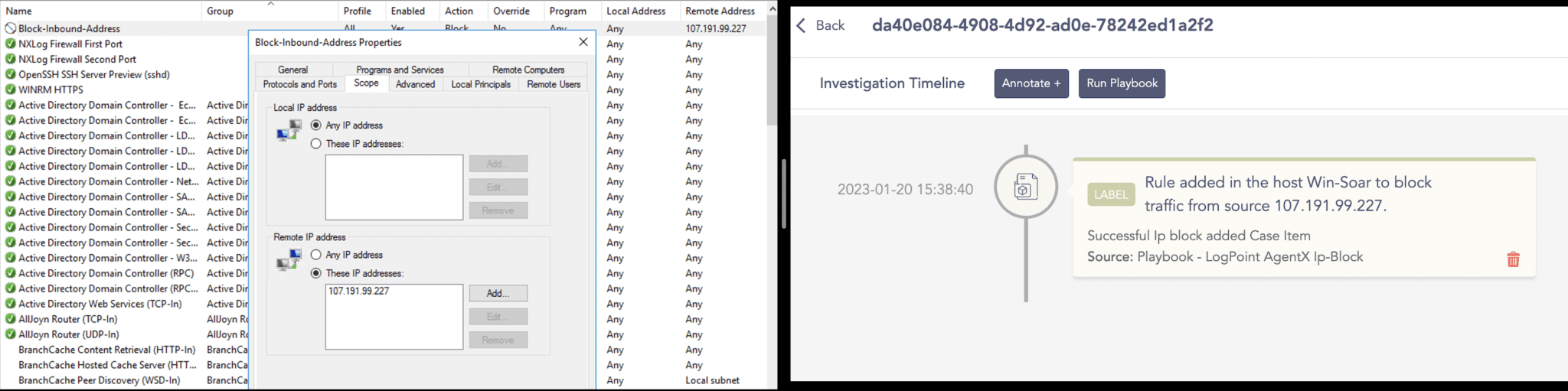 The IP address that was found to be associated with the crypto-mining pool is blocked in the host Win-Soar using the AgentX playbook.