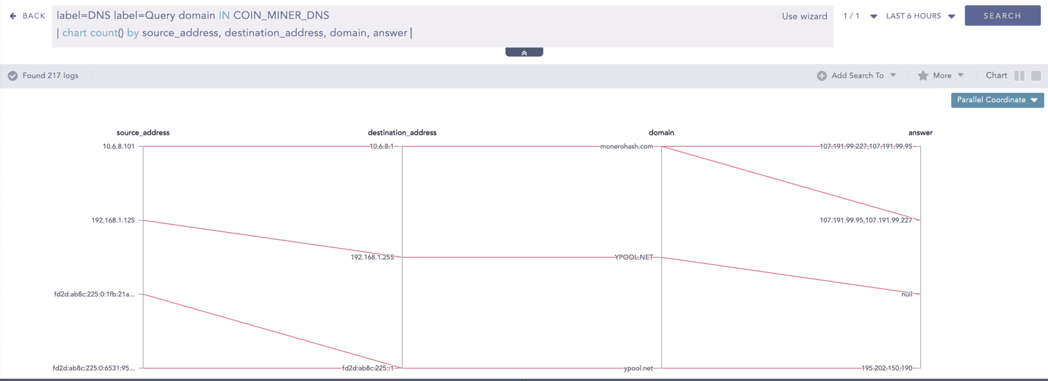 The source address is the host/endpoint that is querying with the local DNS server, i.e. destination_address, to resolve the domain’s IP addresses, and the results can be seen in the answer. It can be seen that new IP addresses related to coin-miner are getting resolved for the same domain.
