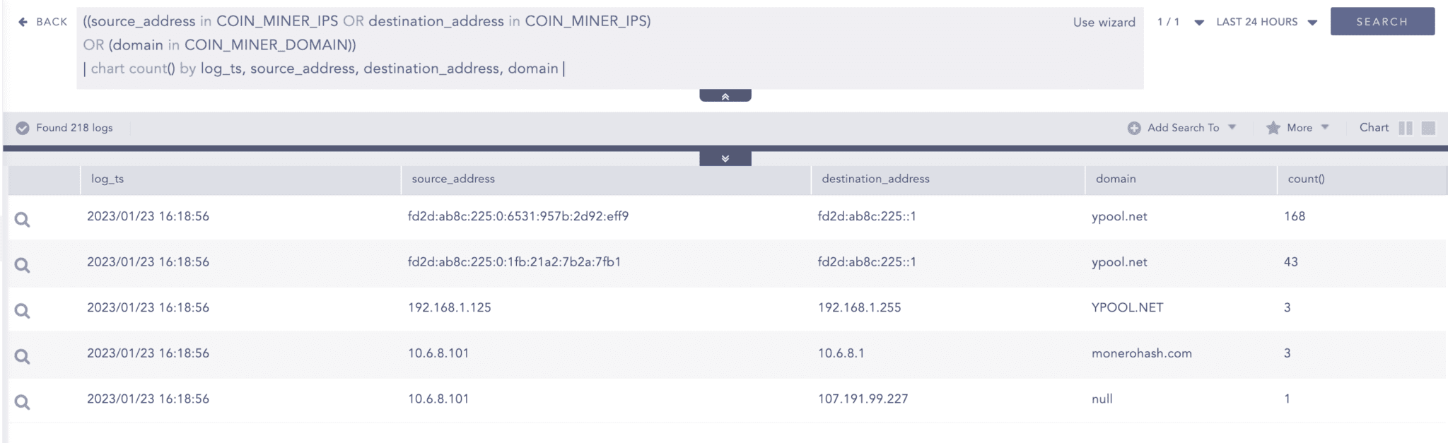 This query can be as used for alerting to detect coin mining activity using all the aggregated logs. It searches for communication with known coin mining IP addresses, and sub-domains by matching them to lists (COIN_MINER_IPS, and COIN_MINER_DOMAIN). This list is prepared to reference from sigma rule and GitHub repos as reported by other security researchers. The query returns any matches found in the network logs, allowing you to detect any coin mining activity on your network.
