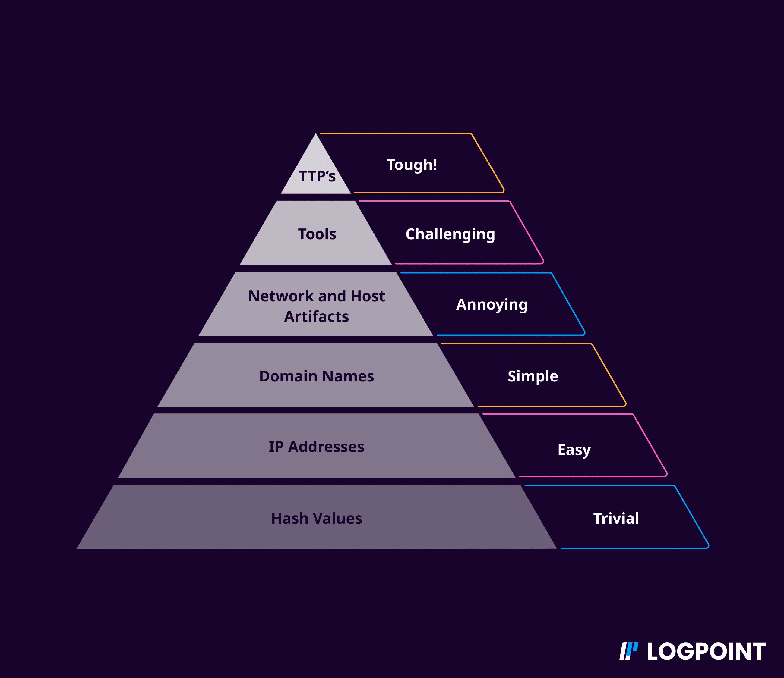 The pyramid represented the comparative strengths and weaknesses of using various IOCs across two dimensions: a stack ranking of various IOC types in terms of how easy they were to implement and the relative size of the universe of each IOC type. At the bottom of the pyramid were hash values which are abundant and easy to detect and at the top of the pyramid were TTPs (tactics, techniques, and procedures i.e behaviors) which are far less abundant and also the most difficult to detect and track.