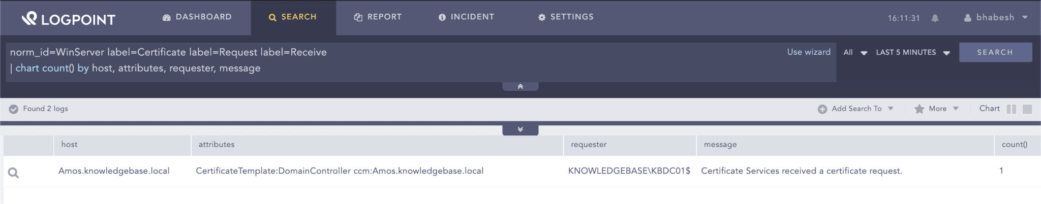 norm_id=WinServer label=Certificate label=Request label=Receive | chart count() by host, attributes, requester, message