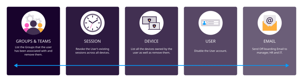 Off-boarding is the formal exit process for employees. This includes deallocating the roles and responsibilities of the employees, returning owned devices, and disabling the account. This proper flow structure makes it a perfect automation case.