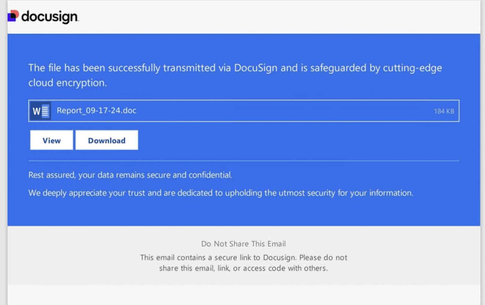 In a recent campaign of Latrodectus malware, a phishing document was disguised as a file purportedly transmitted through DocuSign and protected by advanced security measures. The document's content indicates that it includes a secure link to DocuSign, and the victim downloads needs to visit that webpage to get the actual document. But in reality, it downloads a next-stage payload of Latrodectus, which is a highly obfuscated and unusually large Javascript file.