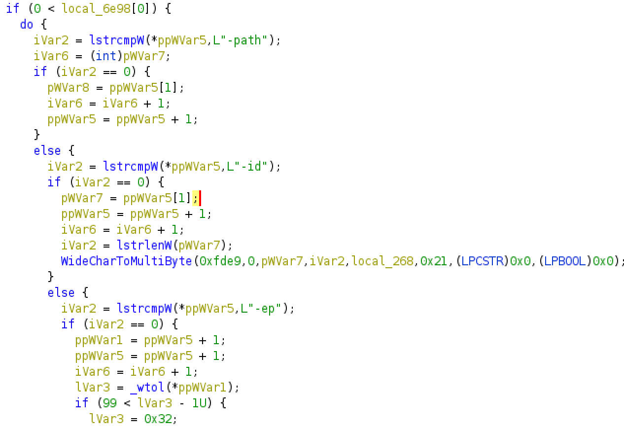 The malware retrieves the command-line string for the process using the GetCommandLineW API and CommandLineToArgvW is used to obtain an array of pointers to the command-line arguments.