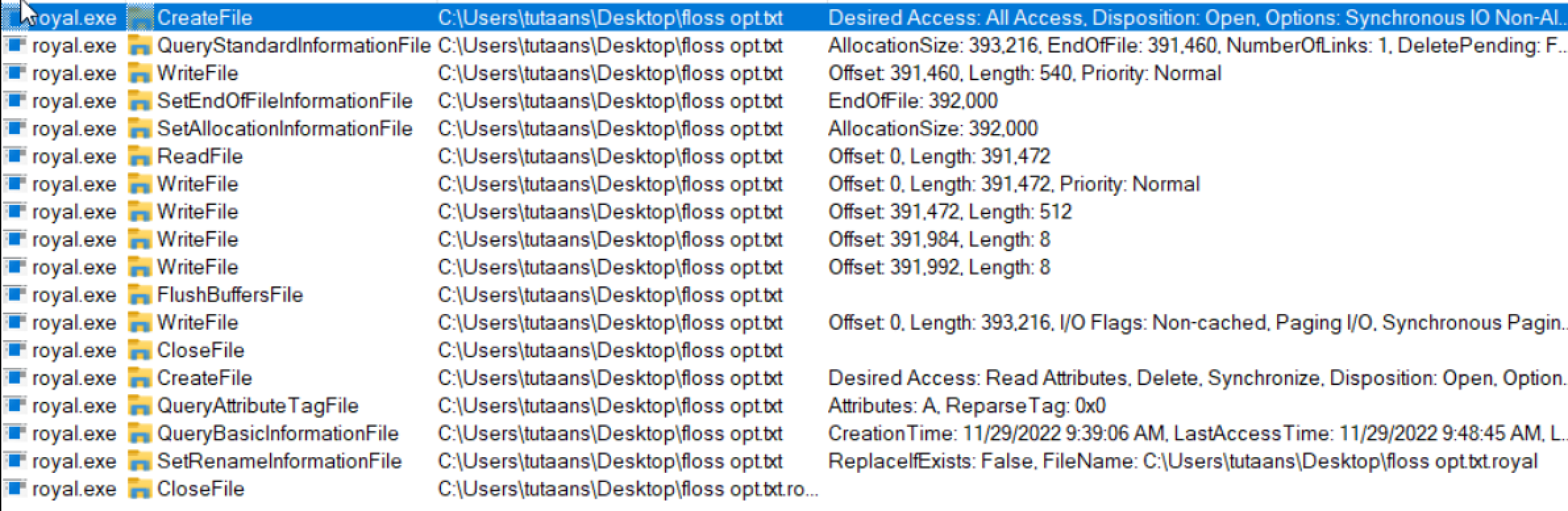 After freeing up the resources, the malware begins the encryption process. While viewing the events through ProcMon, we observed the following actions while a file was being encrypted.