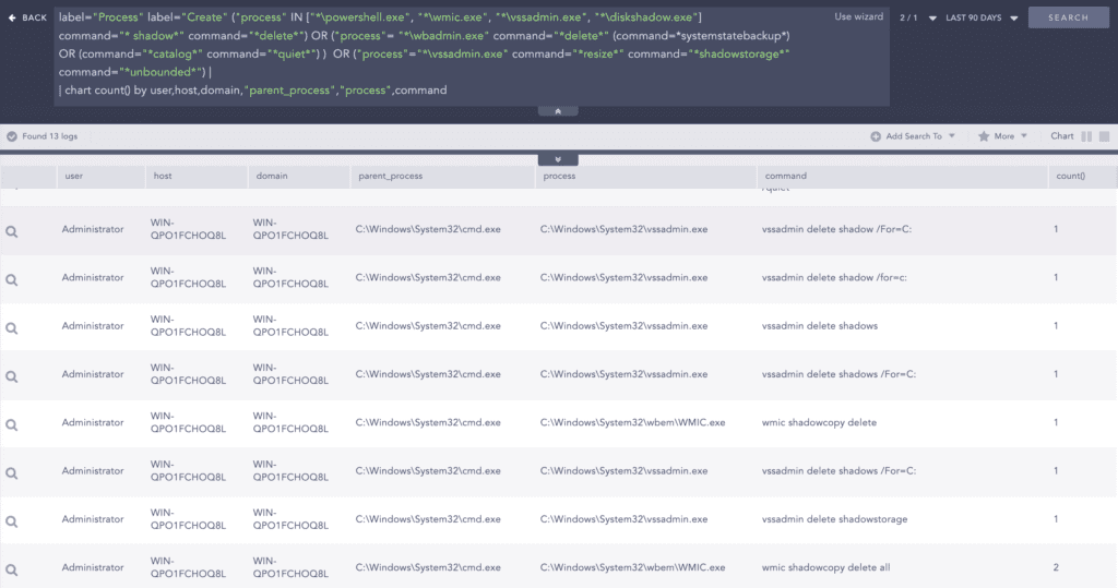 OR (command="*catalog*" command="*quiet*") ) OR ("process"="*\vssadmin.exe" command="*resize*" command="*shadowstorage*" command="*unbounded*")
