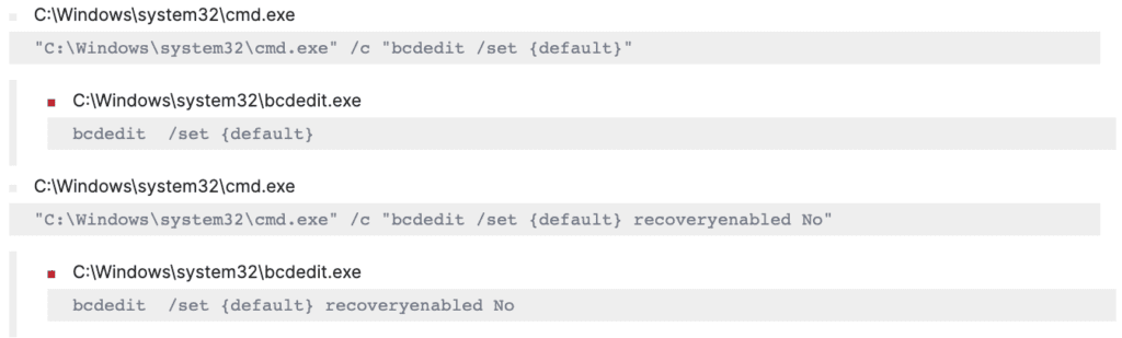 BlackCat also disables recovery in the Windows boot menu using “bcdedit.exe” to inhibit system recovery. We can observe logs for possible modification of boot configuration.