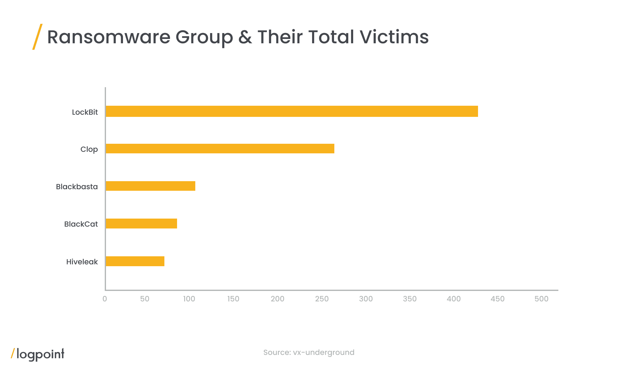 According to our research, BlackCat has the fourth highest number of victims with 90 known victims. Analytics for the top ransomware groups are available for download in Logpoint Alert Rules.