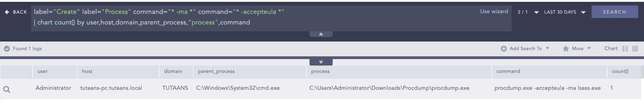 We observed the use of “ProcDump” to dump the LSASS process and obtain the user’s password hash.