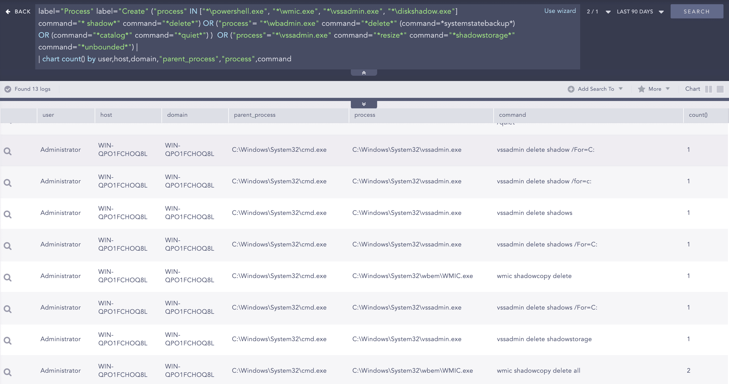 label="Process" label="Create" ("process" IN ["*\powershell.exe", "*\wmic.exe", "*\vssadmin.exe", "*\diskshadow.exe"]