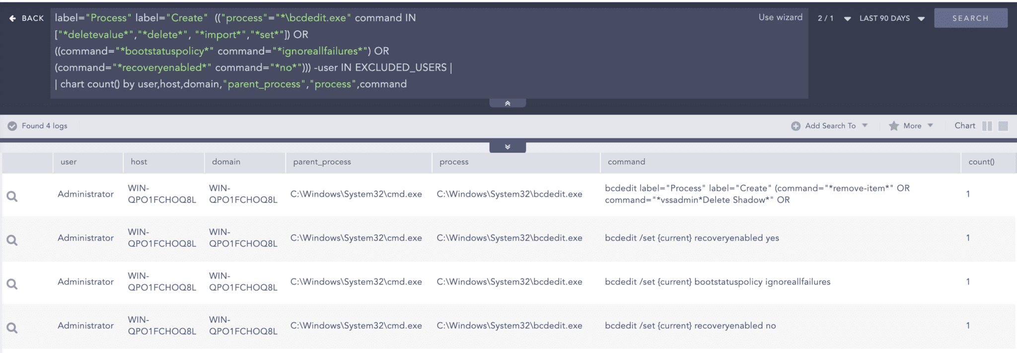 label="Process" label="Create" (("process"="*\bcdedit.exe" command IN