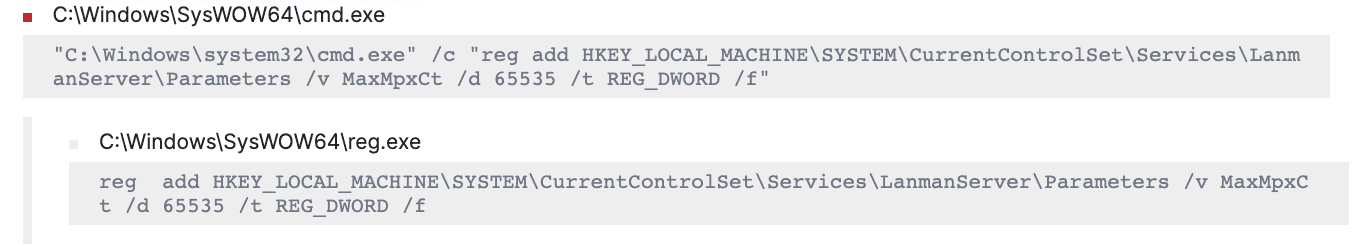 It also used the “reg.exe” binary to modify the Lanmanserver registry key “MaxMpxCt” value which denotes the maximum number of outstanding client requests that can be maintained for each client on the server.