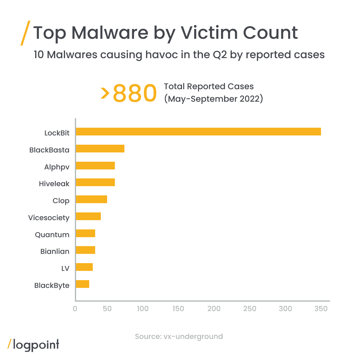 Based on tweets by @VX-underground Twitter bot @RansomwareNews from May 17 to September 221, LockBit accounted for twice as much as its closest competitor, BlackBastaa, Aplhv/BlackCat, Hiveleak, and clop.