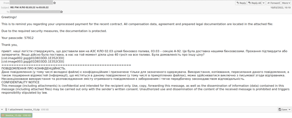 As an example, while looking at cyber attack techniques used against Ukraine, we discovered a case in which a gasoline firm in Kyiv. They received a spearphishing e-mail with an attached counterfeit invoice from another fuel provider. We looked at this in depth into back in April.