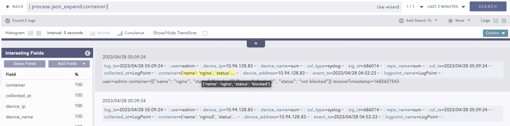 After execution of the JSONExpand command on the above single log.
