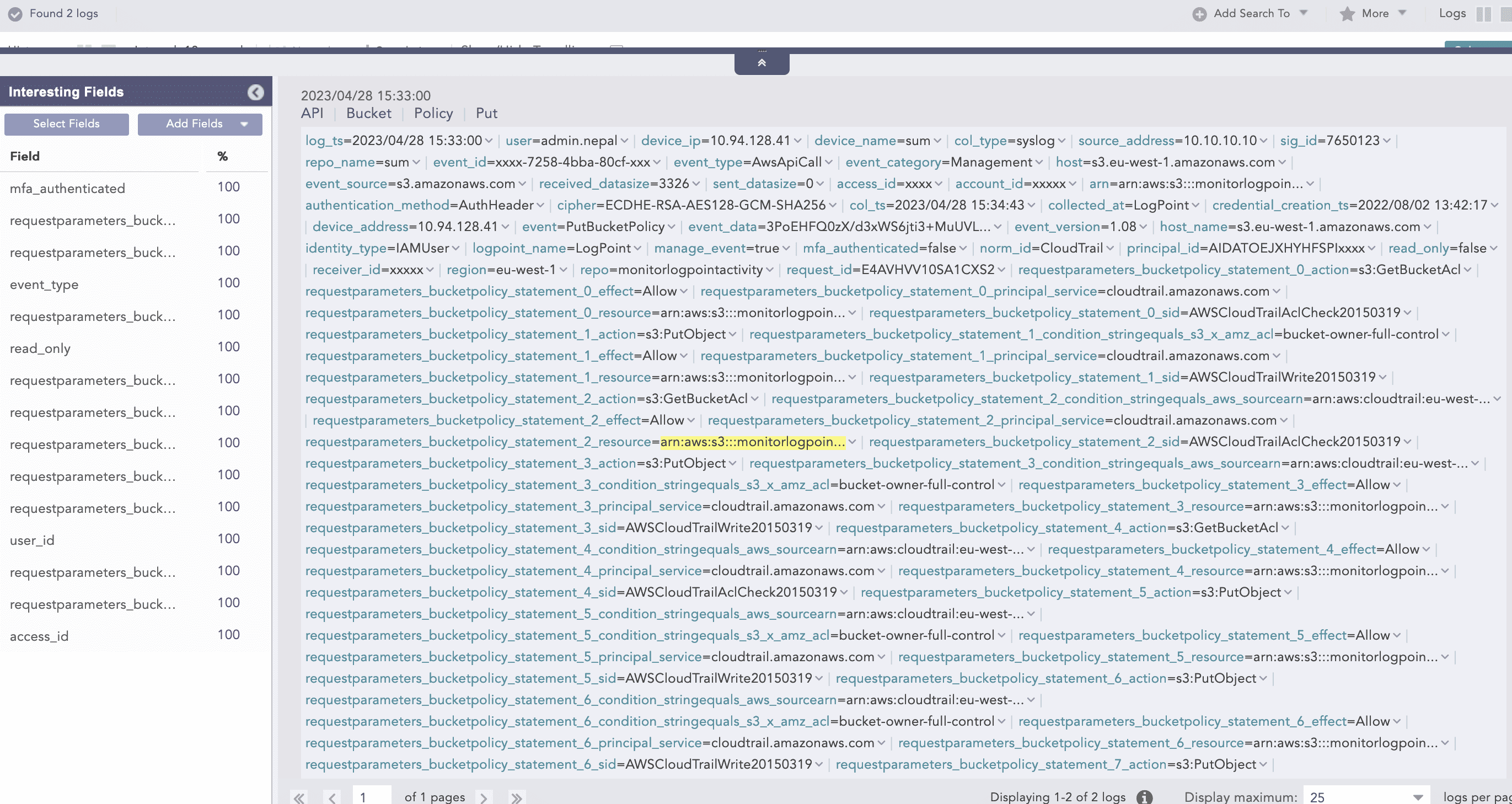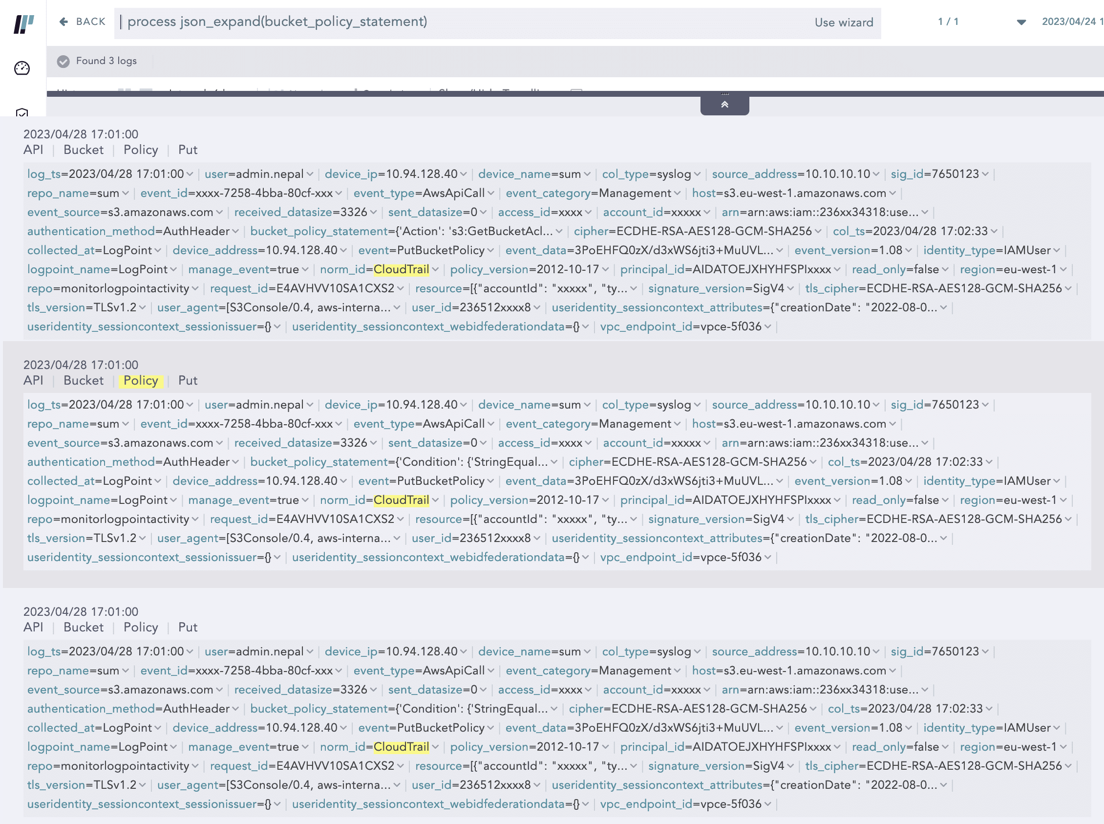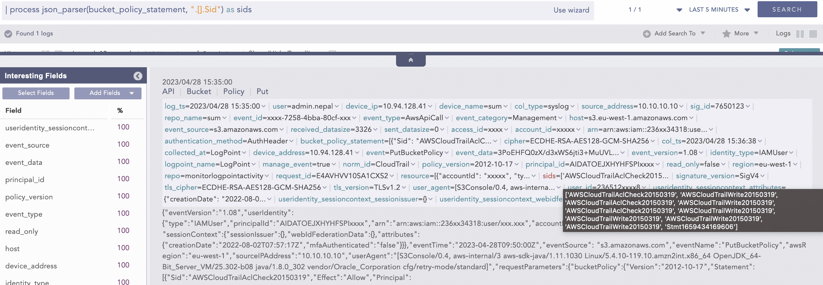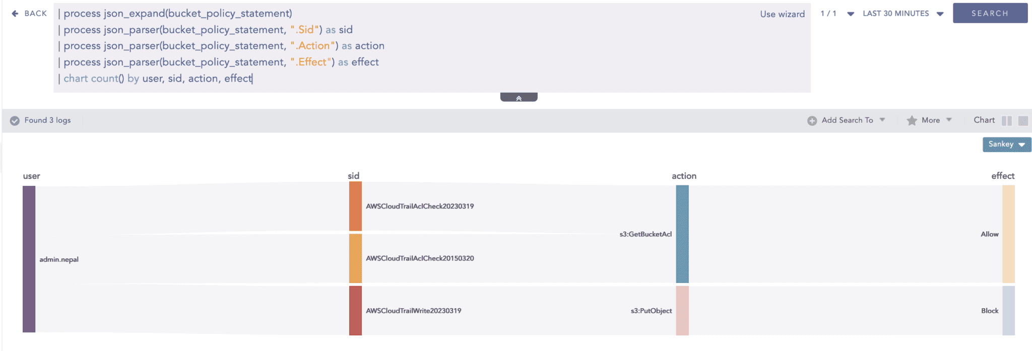 In this log event, “Statement“ inside “bucketPolicy“ contain multiple statement events as a list. JSONExpand can split a single log into multiple instances concerning the number of list items. In the above example, there are 3 Statement events, so the above log would be split into 3 logs and after that, they can be used in chart aggregation.