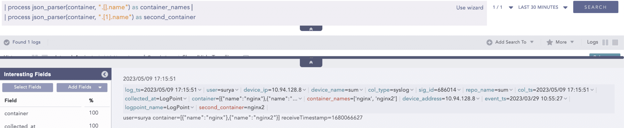 Now, with the JSONParser plugin users can extract values directly from JSON data in the search query, eliminating the need for exhaustive parsing of JSON logs through the Compiled Normalizer. The Compiled Normalizer can be modified to parse data, up to a certain level, with the remaining data stored as JSON strings. These can be parsed in the search query itself if the user needs the values inside them. By parsing the JSON log this way, the number of fields in the indexed log is drastically reduced, resulting in less storage space usage and cleaner parsing that does not affect the index layer.