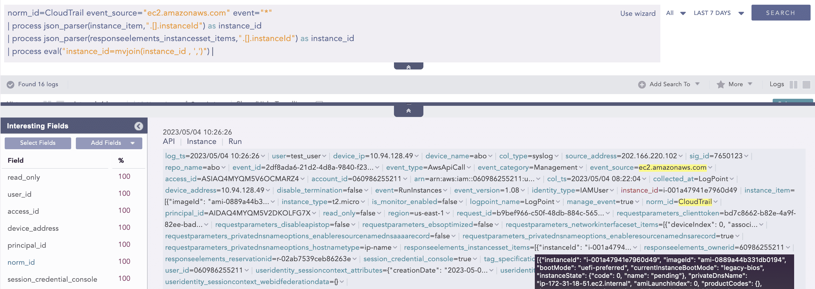 As such, the JSON Parser plugin helps to solve this problem by providing a way to parse and extract information from JSON logs in real time as they are ingested into Logpoint. In the following indexed log, the "instanceId" is extracted from either the "responseelements_instancesset_items" or "instance_item" JSON array objects and renamed as "instance_id" in the resulting indexed log.
