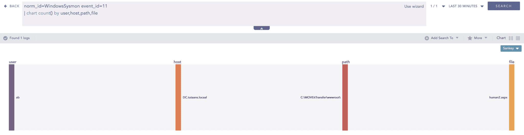 Besides the human2 file, adversaries can utilize any file name so, it is crucial to look for file creation events in the MOVEitTransfer folder. The query can show many events which must be filtered out to reduce false positives for detecting web shells.